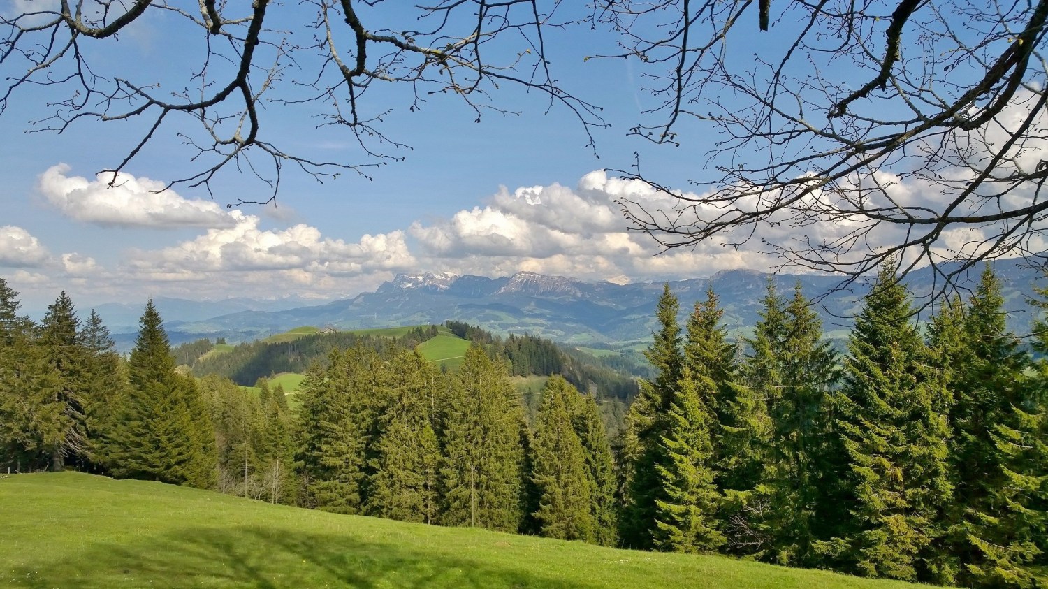 Aurinko paistaa loimottaa siniseltä taivaalta, toisistaan irrallisina kelluvien ”simpsonpilvien” lomasta, nousu hengästyttää. Ympärillämme humisee metsä. Tämä alue on kuuluisa tyylikkäästä metsänhoidostaan. Puut kaadetaan yksi kerrallaan, avohakkuita ei tunneta täällä.