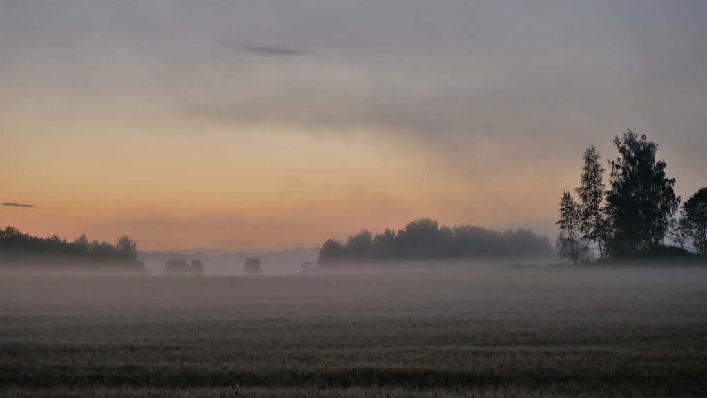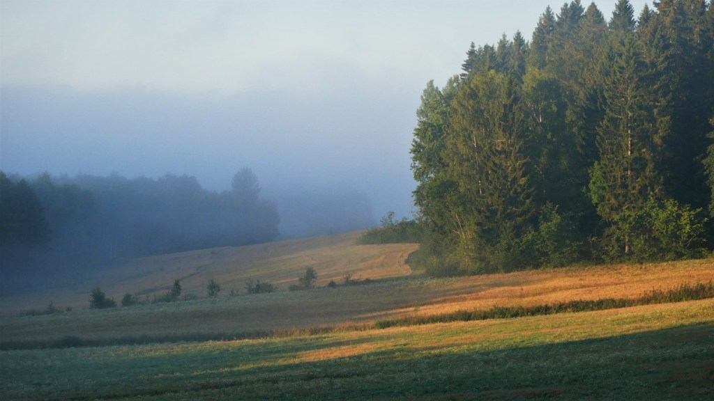 Usvan läpi siivilöityvä aamuaurinko lakaisee jo rinnettä pehmeällä valollaan, värjäten pellot kullan keltaisiksi.