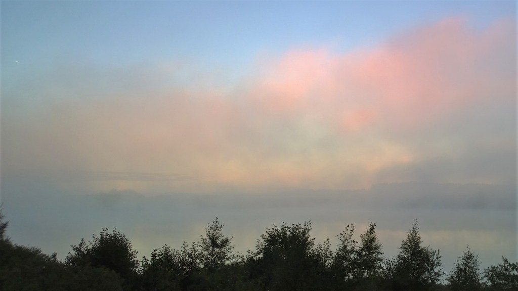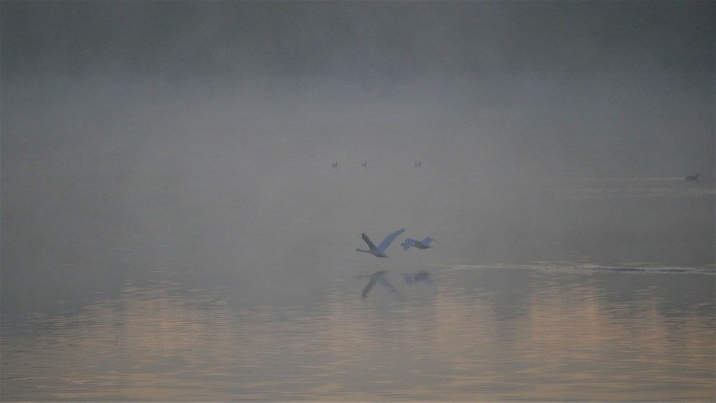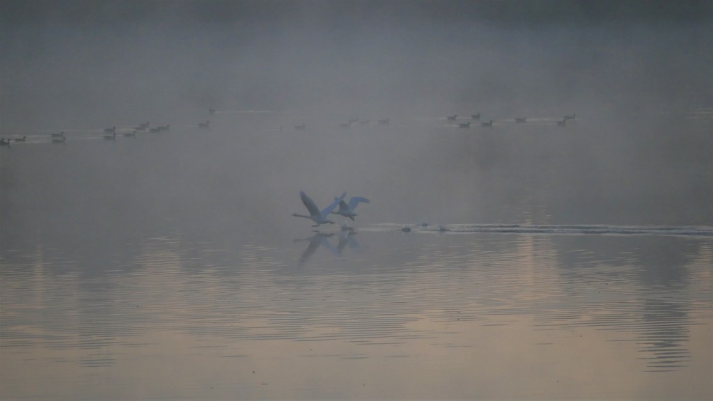 Lintujen vilkkain syysmuutto ei ole vielä alkanut. Silti usvan keskellä lintuja ui kymmeniä – todennäköisesti satoja. Kaakatus ja purpotus on korvia huumaava. Unenomaisen usvamaiseman keskellä ui majesteetillisesti kyhmyjoutsenpari.