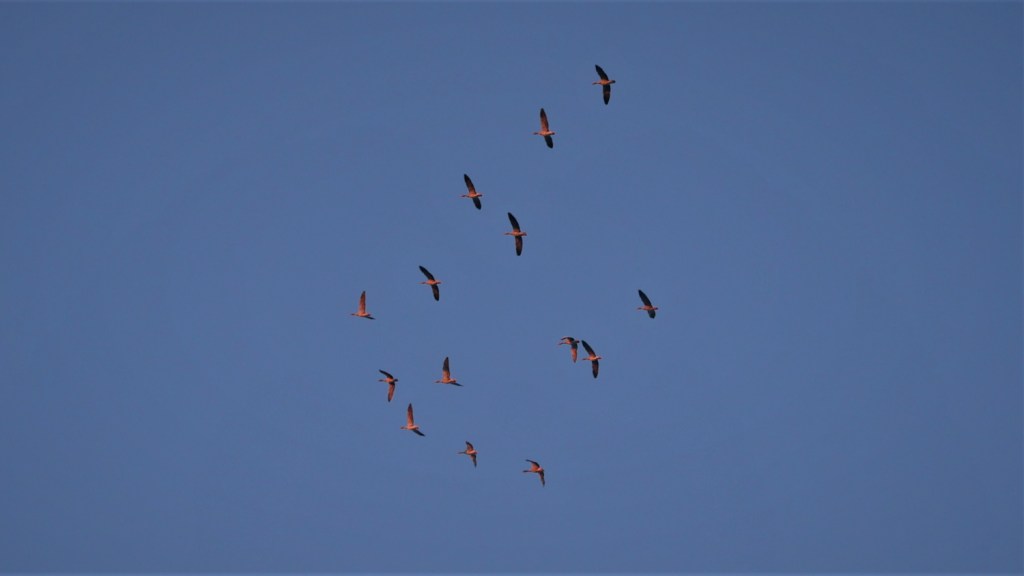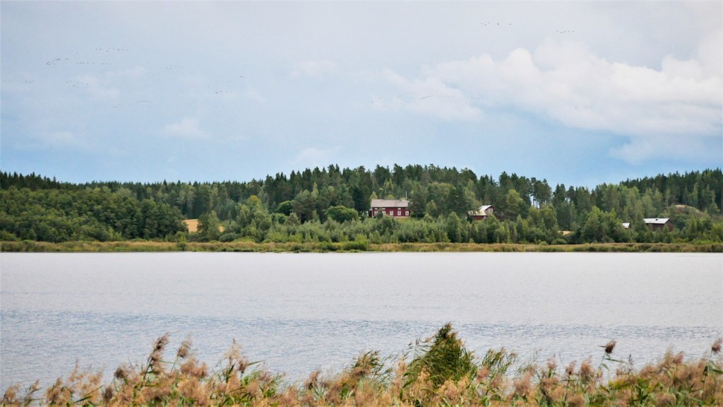 Täällä huomaan käytännössä, että lintujen tunnistaminen ei ole helppoa. Nopeasti yli lentävät linnut, sekä viisto ja vähäinen usvan läpi paistava auringonvalo eivät helpolla auta tunnistamaan yli lentävien hanhien lajia. Olisivatko ne merihanhia?