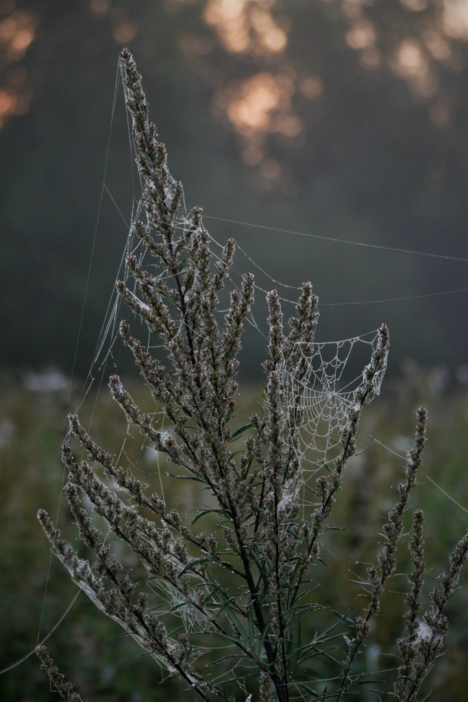 Lähdemme hiljalleen takaisin tulosuuntaamme kasteen paljastamien verkkojen reunustamaa polkua.