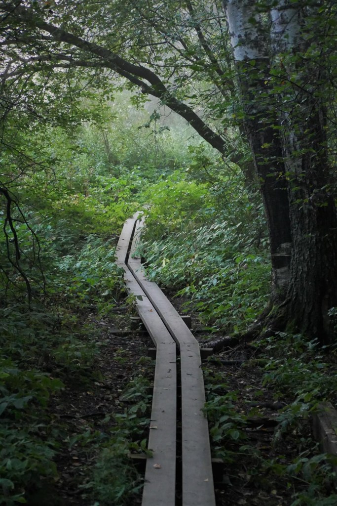 Vanhemmat pitkokset ovat parinkymmenen metrin matkalta kasvillisuuden varjostuksessa kasteesta kosteat ja liukkaat, mutta pian allamme on taas kuivaa ja pitävää, reippaammankin askelluksen sallivaa puuta.