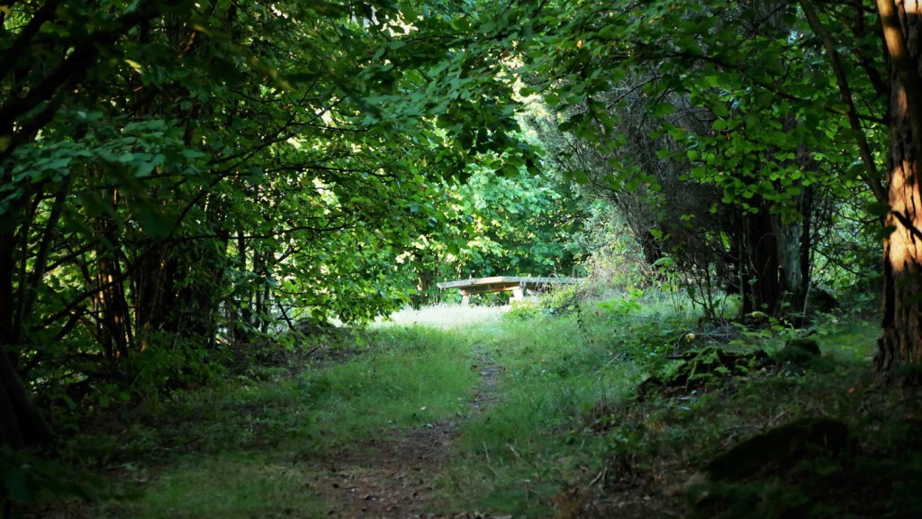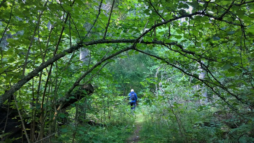 Reitti kulkee pähkinäpensaiden ja suurten puiden sivuitse, ja ohitamme oikealle jäävän Själdbergetin kallion.