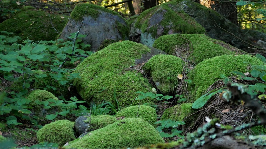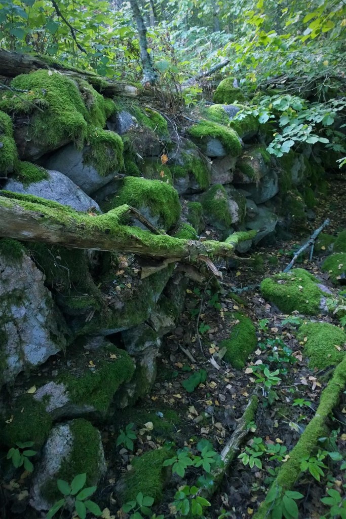 Kun kierrämme mäen ylittävää polkua vastapäivään, lyhyen mutta jyrkän kalliolta laskeutumisen jälkeen vasemmalta puoleltamme löytyy muhkea sammaloitunut kivimuuri.