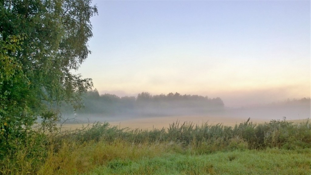 Aamun valkoinen usva taittuu lämpimissä auringonsäteissä kultaan