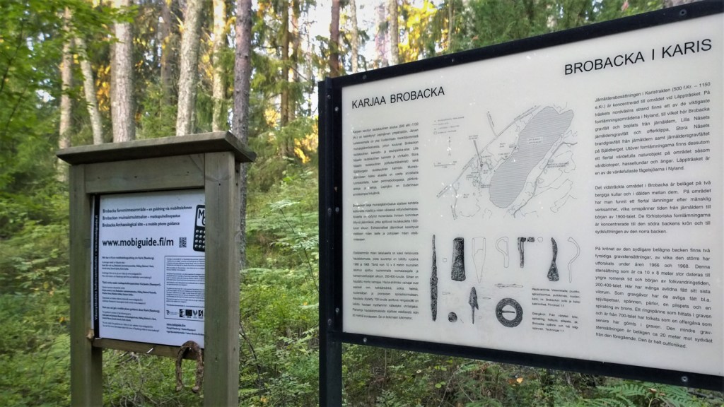 Ojan ylitettyään Brobackalle johtava polku tarjoilee lisää opasteita. Museoviraston suuri kyltti näyttää, mitä kaikkea tällä mäellä voikaan nähdä. Brobackalla on löydetty merkkejä asutuksesta ja viljelyksistä kaukaa rautakaudelta –  aina 1900-luvun alkuun saakka.