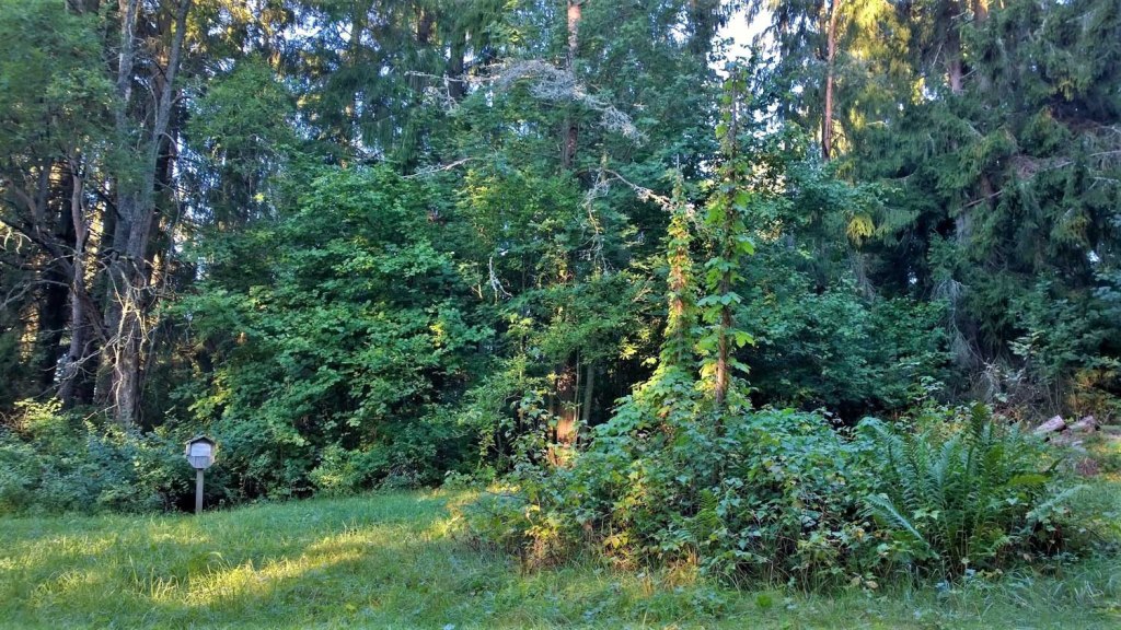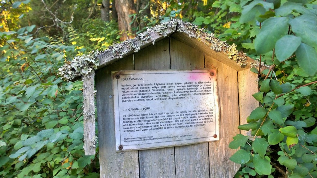 Hetken matkaa niityltä eteenpäin jatkaessamme edessämme leviää aukio, jonka humalaa puskevat seipäät ja viinimarjapensaat paljastavat vailla epäilyksen häivää täällä 1800-luvun lopulle sijainneen torpan paikan.