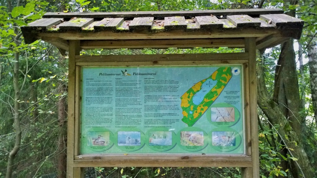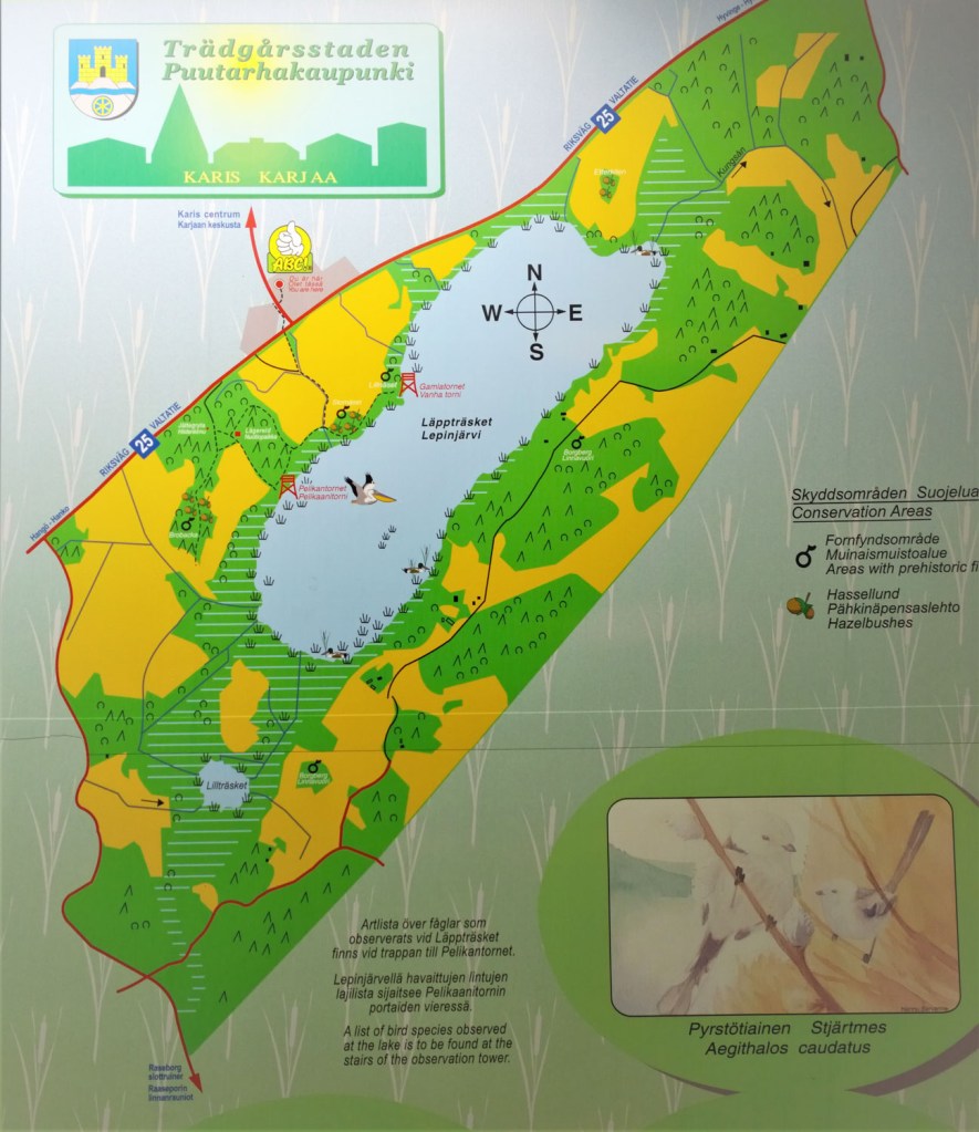 Juuri ennen Pelikaanitornille laskeutuvaa portaikkoa polkujen risteyksen suuri opastetaulu havainnollistaa karttakuvalla sijaintimme – ja sen mikä meitä vielä odottaa. Täällä voisi suotuisissa olosuhteissa bongata ainakin pyrstötiaisen, viiksitimalin, luhtakanan, härkälinnun, kyhmyjoutsenen ja uivelon. Myös ruskosuohaukka, suokukko, ruisrääkkä, pikkujoutsen, mustakurkku-uikku, liro, kalatiira, kurki ja laulujoutsen on täällä tavattu