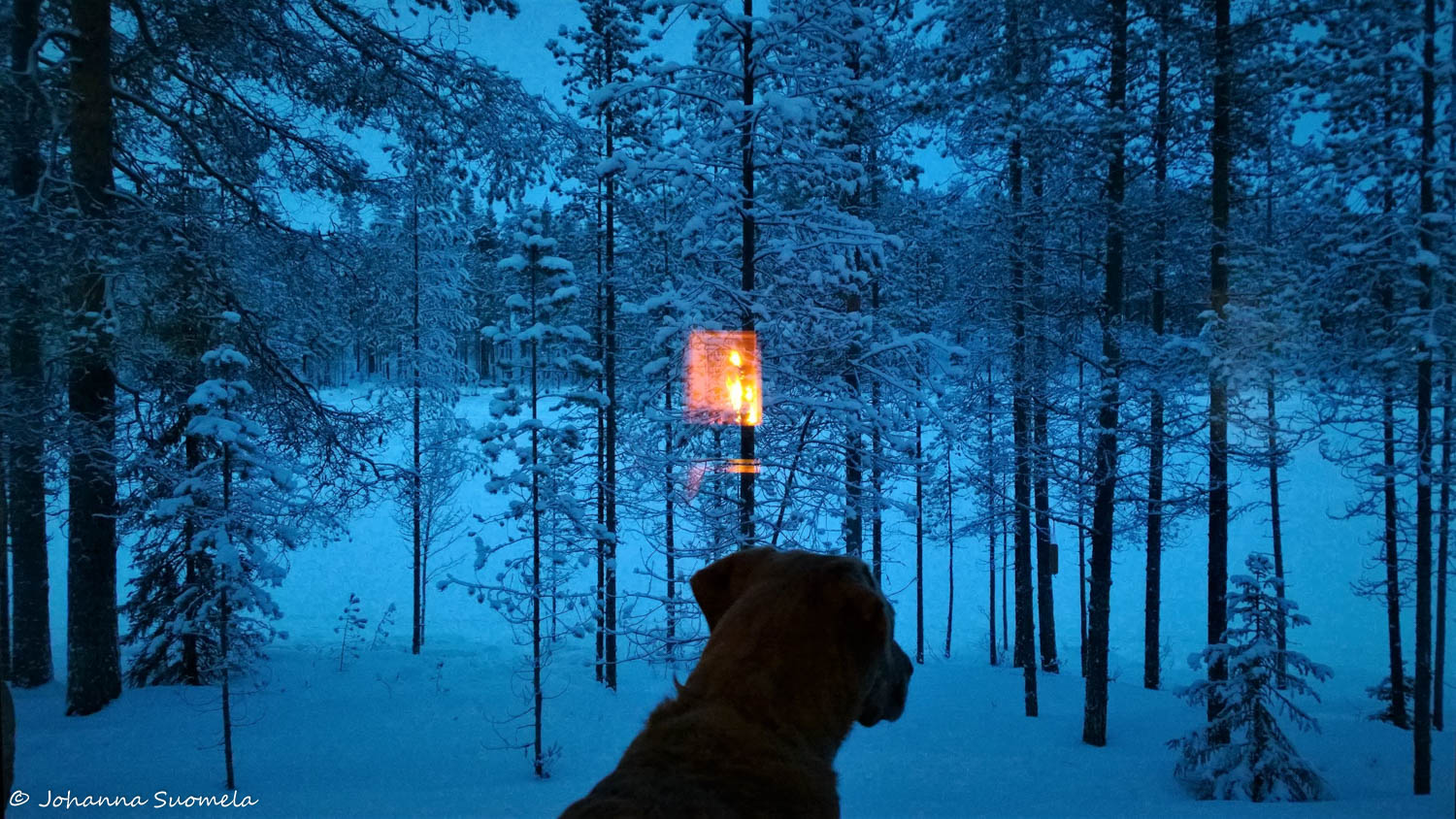Päästyämme Villa Konttaisenrantaan, laitamme takkaan tulet. Katsomme ikkunasta kuinka päivän viimeinenkin valo väistyy tummuvan sinisyyden tieltä. Reissukoira Jetsu päivystää maisemaikkunan edessä valppaana, mutta yksikään lintu ei edes valoisassa ole löytänyt rantamäntyyn ripustamaamme talitankoa.