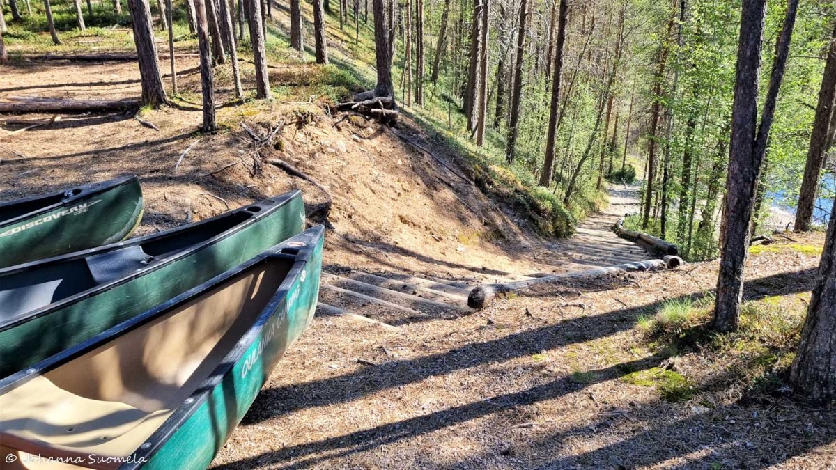 Kiutakönkään alasuvannon vieressä kyytimme pysähtyy. Kanootit lasketaan kyydistä, ja varusteet lastataan kanootteihin. Meille on varattu hiukan pidempi kanootti, jotta mukanamme retkeilevä reissukoira Jetsu mahtuu paremmin mukaan.