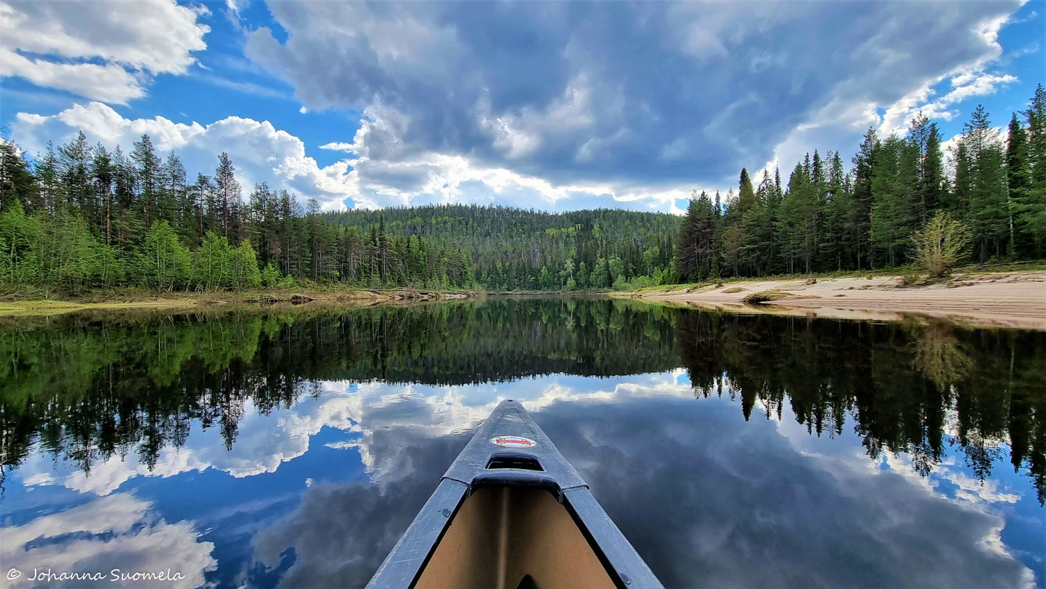 Hetken päästä joen pinta tasoittuu lähes peiliksi, tarjoten taivaallisen kauniita heijastuksia hyvässä yhteistyössä pilvihattaroiden kanssa.