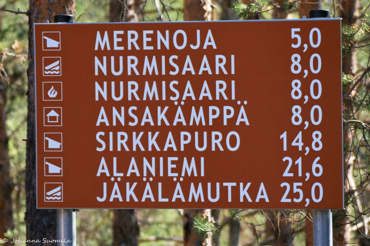 Oulankajoen melonnassa taukopaikoista ei reitillä tule olemaan pulaa. Kyltti lähtöpaikalla lupaa jokaiselle nautintoa etsivälle riittävästi palveluita eväiden nautintaan.
