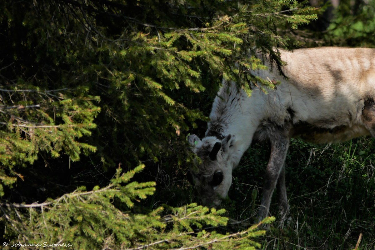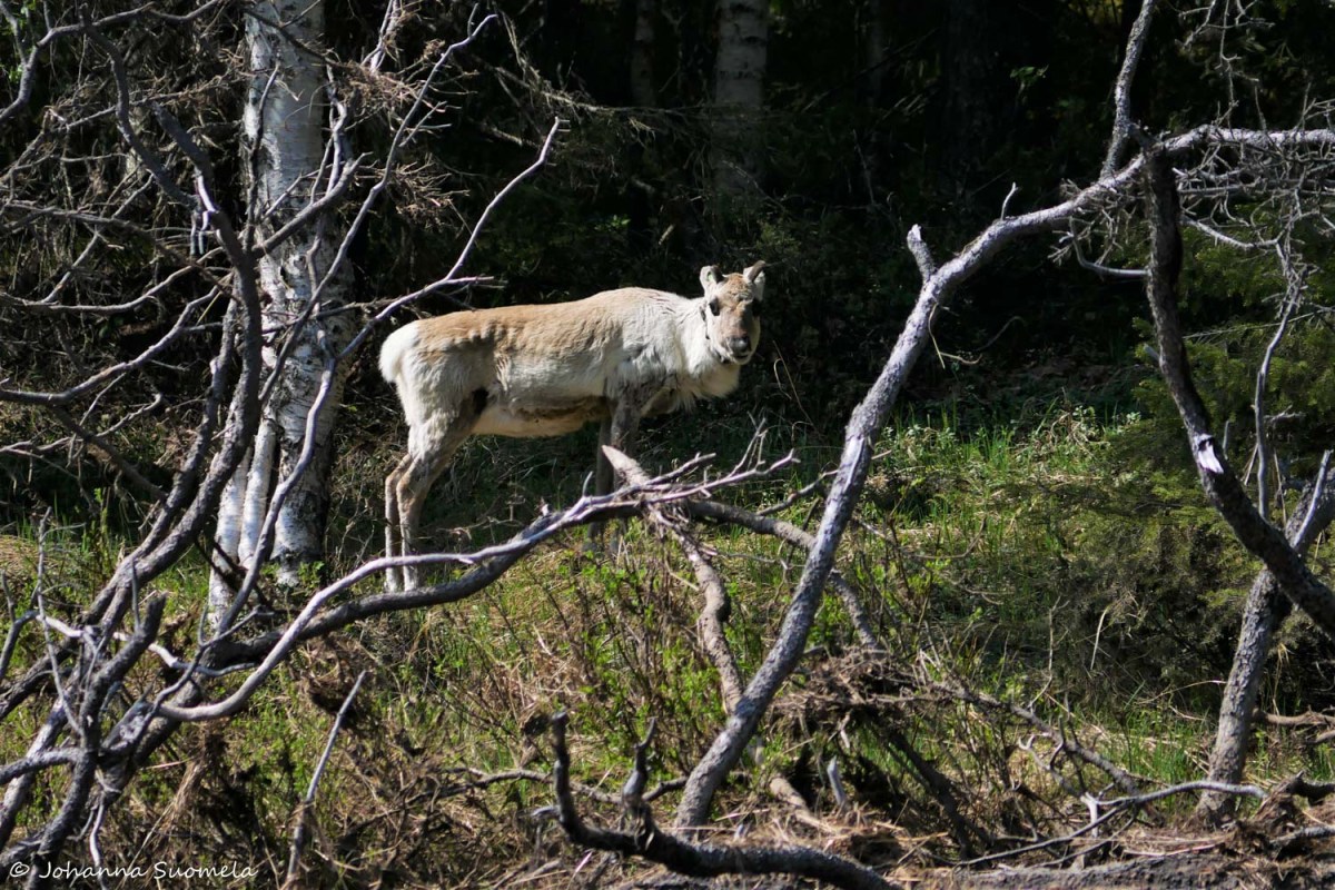 …ja yksinäinen rantavallin ruohokaistaletta ahneesti hotoava porokaan ei koe kanoottiamme uhaksi.