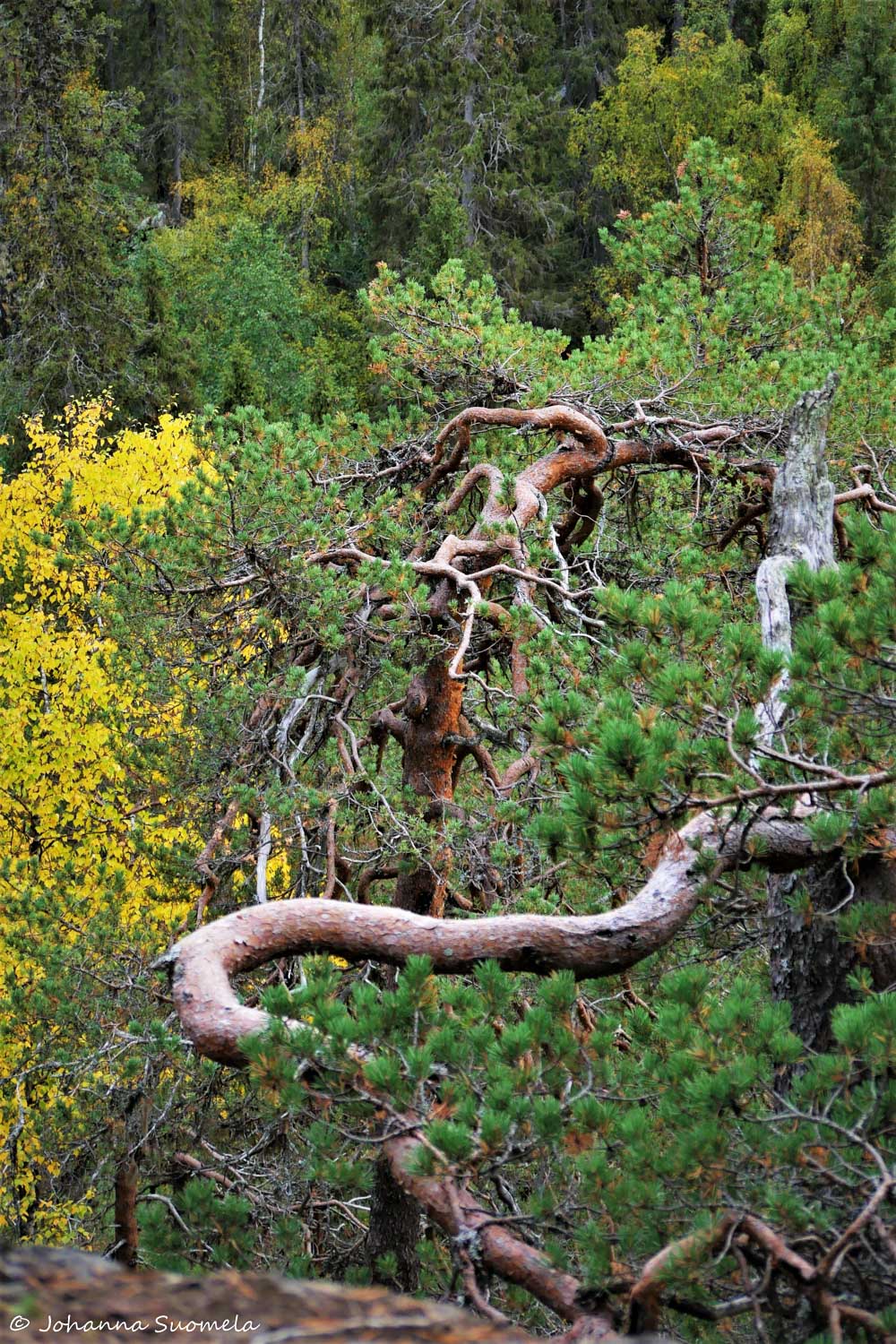 Tuntuu uskomattomalta, että nämä erikoismuotoiset ja sinnikkäät puut ovat uhmanneet kanjonin jyrkillä rinteillä Lapin pakkasia ja talvien tykkyjä.