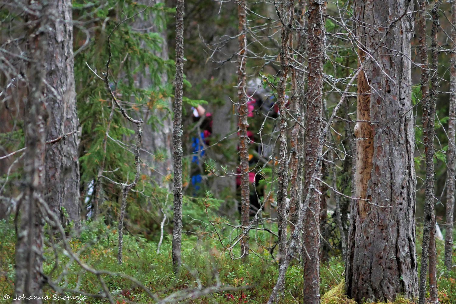 Kameran pitkällä putkella erotan puiden taakse parinkymmenen metrin päähän paikalleen jääneet oletetut koiran omistajat. Toivottavasti se koira nyt tästä eteenpäin pysyy kytkettynä.