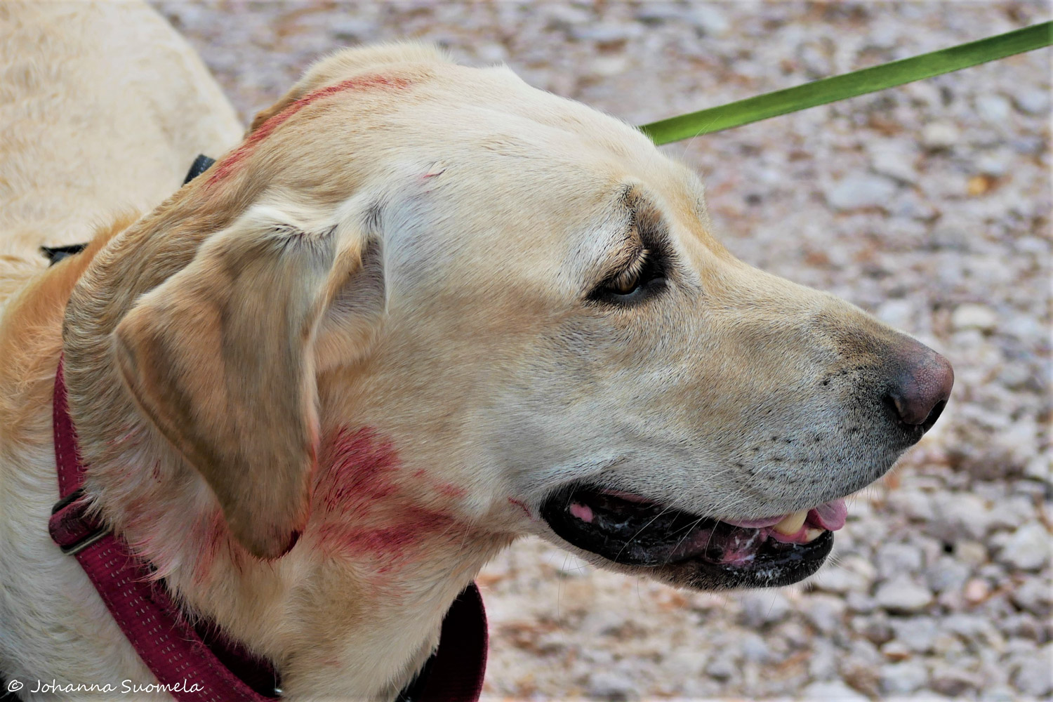 Onneksi tämä välikohtaus ei tapahtunut rotkon reunalla! Silloin lopputulemana olisi voinut olla jotain muuta kuin pieniä pintanaarmuja koirassa ja taluttimen polttama kämmen.