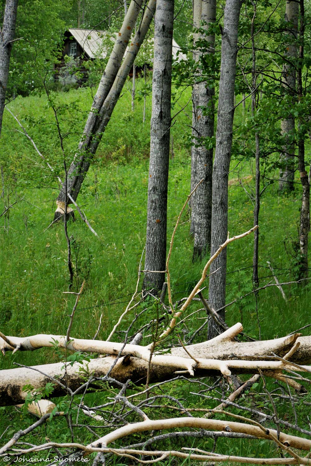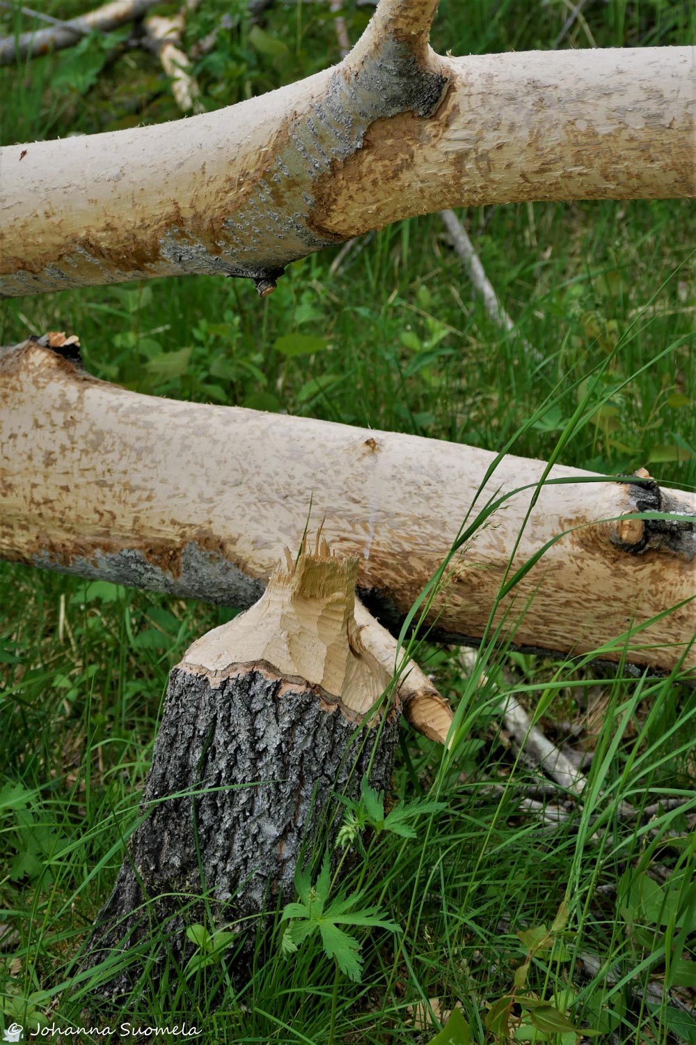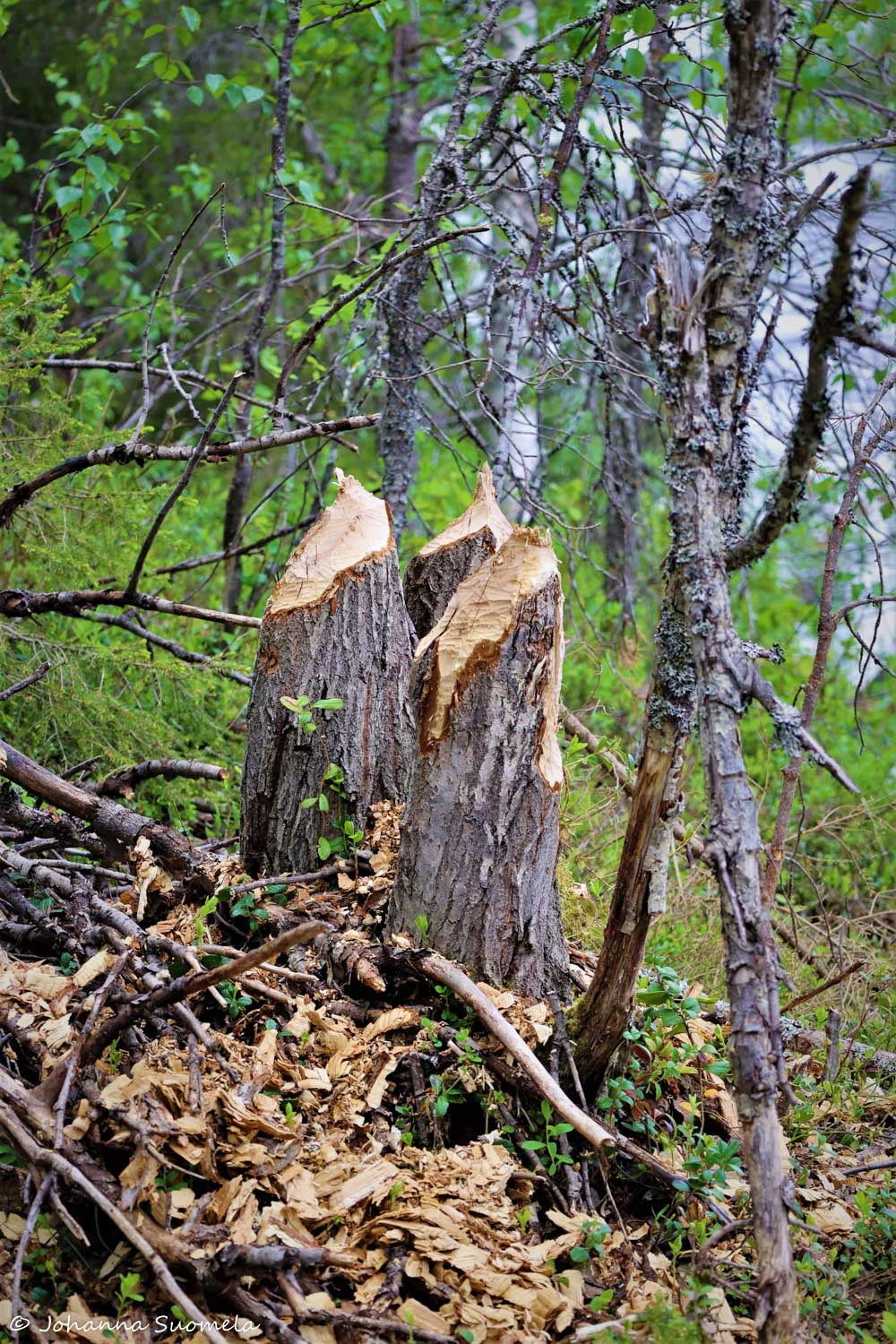 Lehtipuita on kaadettu, kuorittu, ja nakerrettu.